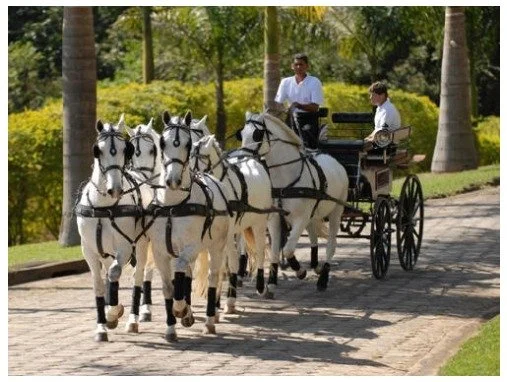 The sport, which has seen Lusitano horses win the World Championship in the ‘four-in-hand’ class, was introduced in Brazil by Interagro, after a period of training of its members and staff at the Coudelaria de Alter, in Portugal, under the direction of Dr. Luis Lupi. Subsequently, five vehicles were imported from Germany, from the well known Künhle industry, which manufactures the best competition vehicles; one is a “Marathon” carriage for that kind of obstacle competition; two of the “Fun-Line” for leisure and less specialized competitions; and two “Phaeton” for leisure and dressage sports. Except for the first one, used for ‘cross-country’ tests, these vehicles may be used as ‘singles’, ‘pairs’ or ‘teams’, the latter including 4 (four-in-hand) or more animals. Interagro already drives teams of 4, 6 and 8 and is starting a team of 10 horses.